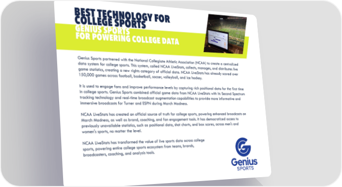 BEST TECHNOLOGY FOR Insert image COLLEGE SPORTS GENIUS SPORTS FOR POWERING COLLEGE DATA Genius Sports partnered with the National Collegiate Athletic Association (NCAA) to create a centralized data system for college sports. This system, called NCAA LiveStats, collects, manages, and distributes live game statistics, creating a new rights category of official data. NCAA LiveStats has already scored over 150,000 games across football, basketball, soccer, volleyball, and ice hockey. It is used to engage fans and improve performance levels by capturing rich positional data for the first time in college sports. Genius Sports combined official game data from NCAA LiveStats with its Second Spectrum tracking technology and real-time broadcast augmentation capabilities to provide more informative and immersive broadcasts for Turner and ESPN during March Madness. NCAA LiveStats has created an official source of truth for college sports, powering enhanced broadcasts on March Madness, as well as brand, coaching, and fan engagement tools. It has democratized access to previously unavailable statistics, such as positional data, shot charts, and box scores, across men's and women's sports, no matter the level. NCAA LiveStats has transformed the value of live sports data across college sports, powering entire college sports ecosystem from teams, brands, broadcasters, coaching, and analysis tools. LOGO