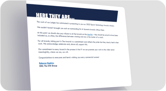 HERE THEY ARE… The work of our judges has culminated in presenting to you our 2023 Sports Technology Awards winners. We couldn’t haven’t brought you such an outstanding list of dynamic brands without them. At this point we should also pay tribute to all the brands on the shortlist – they should be proud to have been included as, so often, the difference between winning and not, is the matter of a mark. For all brands, taking part in The Awards is a commitment and reflects the pride that they clearly feel in their work. We acknowledge, celebrate and, above all, support this. Our commitment to every brand in the process is that if we can promote your work to the wider sector meaningfully, where we can, we will. Congratulations to everyone and here’s wishing you every commercial success! Rebecca Hopkins CEO, The STA Group