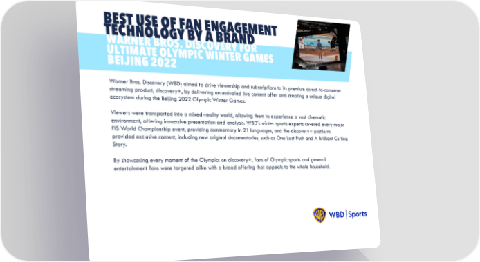 BEST USE OF FAN ENGAGEMENT Insert image TECHNOLOGY BY A BRAND WARNER BROS. DISCOVERY FOR ULTIMATE OLYMPIC WINTER GAMES BEIJING 2022 Warner Bros. Discovery (WBD) aimed to drive viewership and subscriptions to its premium direct-to-consumer streaming product, discovery+, by delivering an unrivaled live content offer and creating a unique digital ecosystem during the Beijing 2022 Olympic Winter Games. Viewers were transported into a mixed-reality world, allowing them to experience a vast cinematic environment, offering immersive presentation and analysis. WBD's winter sports experts covered every major FIS World Championship event, providing commentary in 21 languages, and the discovery+ platform provided exclusive content, including new original documentaries, such as One Last Push and A Brilliant Curling Story. By showcasing every moment of the Olympics on discovery+, fans of Olympic sports and general entertainment fans were targeted alike with a broad offering that appeals to the whole household.