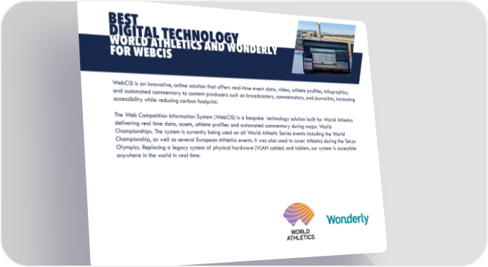 BEST DIGITAL TECHNOLOGY WORLD ATHLETICS AND WONDERLY FOR WEBCIS WebCIS is an innovative, online solution that offers real-time event data, video, athlete profiles, infographics, and automated commentary to content producers such as broadcasters, commentators, and journalists, increasing accessibility while reducing carbon footprint. The Web Competition Information System (WebCIS) is a bespoke technology solution built for World Athletics delivering real time data, assets, athlete profiles and automated commentary during major. World Championships. The system is currently being used on all World Athletic Series events including the World Championship, as well as several European Athletics events. It was also used to cover Athletics during the Tokyo Olympics. Replacing a legacy system of physical hardware (VLAN cables) and tablets, our system is accessible anywhere in the world in real time. LOGO