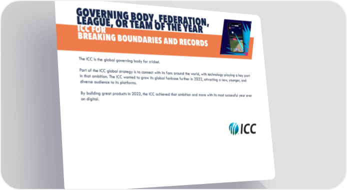 GOVERNING BODY, FEDERATION, LEAGUE, OR TEAM OF THE YEAR ICC FOR BREAKING BOUNDARIES AND RECORDS The ICC is the global governing body for cricket. Part of the ICC global strategy is to connect with its fans around the world, with technology playing a key part in that ambition. The ICC wanted to grow its global fanbase further in 2022, attracting a new, younger, and diverse audience to its platforms. By building great products in 2022, the ICC achieved that ambition and more with its most successful year ever on digital.