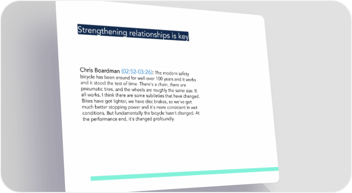 Strengthening relationships is key Chris Boardman (02:52-03:26): The modern safety bicycle has been around for well over 100 years and it works and it stood the test of time. There's a chain, there are pneumatic tires, and the wheels are roughly the same size. It all works. I think there are some subtleties that have changed. Bikes have got lighter, we have disc brakes, so we've got much better stopping power and it's more consistent in wet conditions. But fundamentally the bicycle hasn't changed. At the performance end, it's changed profoundly.