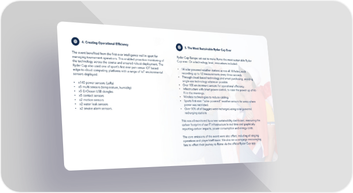 The event benefited from the first ever intelligence wall in sport for Ryder Cup Europe set out to make Rome the most sustainable Ryder managing tournament operations. This enabled proactive monitoring of Cup ever. On a technology level, innovations included: the technology across the course and ensured robust deployment. The Ryder Cup also used one of sport’s first ever pan-venue IOT based • 14 solar powered weather stations across all 18 holes, each edge-to-cloud computing platforms with a range of IoT environmental recording up to 12 measurements every three seconds. sensors deployed: • Through cloud-based technology and smart purchasing, avoiding single-use technology wherever possible. • x140 power sensors (LoRa) • Over 100 environment sensors for operational efficiency. • x5 multi sensors (temperature, humidity) • Infrastructure with smart power control, to ease the power-up of Wi- • x5 EnOcean USB dongles Fi in the mornings. • x5 contact sensors • Wireless technologies to reduce cabling. • x2 motion sensors • Sports first-ever “solar-powered” weather sensors for areas where • x2 water leak sensors power was restricted. • x2 smoke alarm sensors. • Over 50% of all buggies were recharged using solar-powered recharging stations This was all monitored by a new sustainability dashboard, measuring the carbon footprint of our IT infrastructure in real time and graphically reporting carbon impacts, power consumption and energy costs. The core emissions of the event were also offset, including all staging operations and player/staff travel. We also ran a campaign encouraging fans to offset their journey to Rome via the official Ryder Cup app.