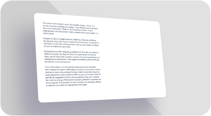 The sweet smell of stadium grass, the palpable energy in the air, the sounds of people chanting and singing—these idiosyncrasies help make each event memorable. While AI can personalise content, it can’t duplicate the near-transcendent feeling created when people gather in a shared space. Despite the allure of digital stadiums crafted by metaverse architects, the physical arena will remain the epicentre of live events. The pandemic seemed to confirm this, with live events making a resounding comeback as soon as restrictions were lifted. Digital platforms offer intriguing possibilities for fans who are unable to attend live events. But they will never be a replacement for the real thing. Hybrid events that combine in-person and virtual experiences are emerging as a compromise. They expand accessibility while preserving the essence of live participation. For us, the solution is to thoughtfully blend AI-powered and other technological innovations while keeping the focus on the action inside a stadium or arena. Venues should remain a blank canvas that should be easily adapted and personalised to differing uses and formats. While VR and AR can supplement that in-venue experience, they can’t replicate the collective energy of thousands of people gathered to experience an event together. If integrated with care, however, AI’s emerging abilities to enhance live events can help preserve that magic.