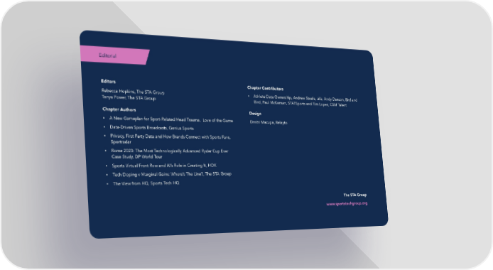 Editorial Rebecca Hopkins, The STA Group • Athlete Data Ownership, Andrew Steele, aila, Andy Danson, Bird and Tanya Power, The STA Group Bird, Paul McKernan, STATSports and Tim Lopez, CSM Talent • A New Gameplan for Sport-Related Head Trauma, Love of the Game Dmitri Macupa, Relayto • Data-Driven Sports Broadcasts, Genius Sports • Privacy, First Party Data and How Brands Connect with Sports Fans, Sportradar • Rome 2023: The Most Technologically Advanced Ryder Cup Ever Case Study, DP World Tour • Sports Virtual Front Row and AI’s Role in Creating It, HOK • Tech Doping v Marginal Gains: Where’s The Line?, The STA Group • The View from HQ, Sports Tech HQ