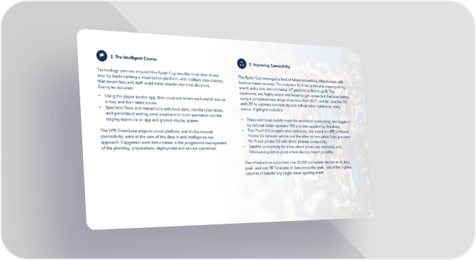 Technology partners ensured this Ryder Cup was the most data-driven The Ryder Cup leveraged a best of breed networking infrastructure with ever by implementing a visualisation platform, with multiple data sources, location-based services. This included Wi-Fi 6e (a first at a major sporting that meant fans and staff could make smarter real-time decisions. event) and a true environmental IoT platform (a first for golf). The Examples included: experience was highly secure and easier to get connected than ever before, • Using the player locator app, fans could see where each match was via using a complementary range of services from Wi-Fi, cellular, satellite, 5G a map and their latest scores. and LTE to optimise connectivity and deliver richer content on every • Spectator flows and interactions with food stalls, merchandise stores, device. Highlights included: and grandstand seating were visualised for both spectators and the • Three additional mobile masts for enhanced connectivity, two supplied staging teams via an app and graded display system. by national Italian operator TIM and one supplied by Vodafone. The HPE GreenLake edge-to-cloud platform, and Aruba network • Two Proof of Concept’s were delivered, one based on HPE’s Athonet connectivity, were at the core of this data-in and intelligence-out Private 5G network service and the other an innovative Solar-powered approach. Capgemini were instrumental in the programme management Wi-Fi and private 5G with direct internet connectivity. of the planning, preparations, deployment and service operations. • Satellite connectivity for areas where power was restricted, and Microwave point-to-point where ducting wasn’t possible. The infrastructure supported over 20,000 concurrent devices at its daily peak, and over 90 Terabytes of data across the week, one of the highest volumes of data for any single venue sporting event.