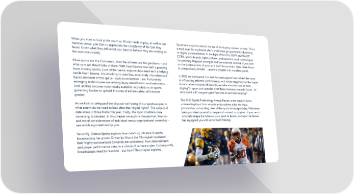 When you start to look at the event as 18 mini fields of play, as well as one Sportradar explores data in the era of third-party cookies’ demise. This is massive venue, you start to appreciate the complexity of the task they a must-read for any brand which undertakes programmatic advertising faced. Given what they delivered, you have to believe they are working on or digital personalization. In the light of the EU’s GDPR and the US’ the next one already. CCPA, sports brands, rights-holders, and sponsors need technologies for precisely targeted strategies and personalized content. If you work If live sports are the Colosseum, then the athletes are the gladiators – and on the business side of sport and don’t know what a Data Clean Room what care we should take of them. With head injuries now such a pressing is, you probably should …and this chapter is an excellent guide. issue in many sports, Love of the Game, explores how med-tech is helping tackle brain trauma. It is shocking to read how extensively misunderstood In 2022 we bemoaned that tech-forward apparel was behind the curve basics elements of this space - such as concussion - are. Fortunately in influencing athletes’ performance; well, it has caught up! As the ‘super emerging technologies are refining injury identification and treatments. shoe’ scythes seconds off records, we take a historic look at ‘tech And, as they become more readily available. expectations on sports doping’ in sport and consider what those moments mean in future. At governing bodies to uphold this area of athlete safety will become what point will ‘marginal gains’ become all out ‘tech doping’? greater. The 2023 Sports Technology Annual Review is the result of some As we look to safeguard the physical well-being of our sportspeople, to outstanding input from wizards and prophets alike, sharing a what extent do we need to look after their digital rights? The subject of provocative and exciting view of the sports landscape today. Whichever data arises in three forms this year. Firstly, the topic of athlete data team you deem yourself to be part of – wizard or prophet - if your remit ownership is debated. In this chapter we explore the practical, financial is to help shape the future of your sport or brand, we hope The Review and moral considerations of individual versus organizational ownership – has equipped you with some fresh thinking. see which argument swings you. Secondly, Genius Sports explains how data’s significance in sports broadcasting has grown. Driven by AI and the ‘Moneyball revolution’, fans’ highly personalized demands are considered, from detailed team and player performance data, to a choice of camera angles. Consequently, broadcasters need to respond – but how? This chapter explains.