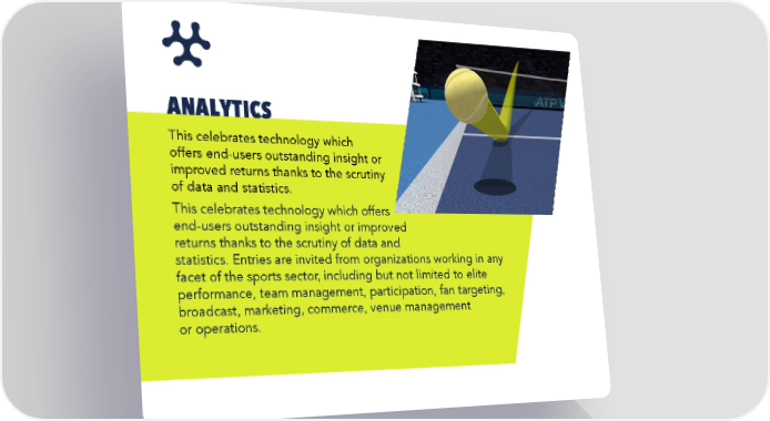 ANALYTICS This celebrates technology which offers end-users outstanding insight or improved returns thanks to the scrutiny of data and statistics. This celebrates technology which offers end-users outstanding insight or improved returns thanks to the scrutiny of data and statistics. Entries are invited from organizations working in any facet of the sports sector, including but not limited to elite performance, team management, participation, fan targeting, broadcast, marketing, commerce, venue management or operations.