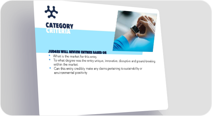 CATEGORY CRITERIA JUDGES WILL REVIEW ENTRIES BASED ON • What is the market for this entry • To what degree was the entry unique, innovative, disruptive and ground-breaking within the market • Can this entry credibly make any claims pertaining to sustainability or environmental positivity