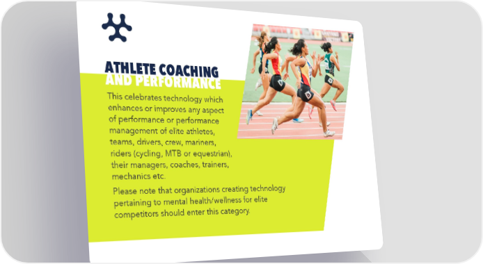 ATHLETE COACHING AND PERFORMANCE This celebrates technology which enhances or improves any aspect of performance or performance management of elite athletes, teams, drivers, crew, mariners, riders (cycling, MTB or equestrian), their managers, coaches, trainers, mechanics etc. Please note that organizations creating technology pertaining to mental health/wellness for elite competitors should enter this category.