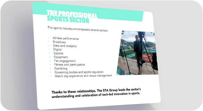THEPROFESSIONAL SPORTSSECTOR Thesports industry encompasses several sectors • Athlete performance • Broadcast • Data and analytics • Digital • Esports • Equipment • Fanengagement • Fitness and participation • Gambling • Governing bodies and sports regulation • Match day experience and venue management Thanks to these relationships, The STA Group leads the sector’s understanding and celebration of tech-led innovation in sports.