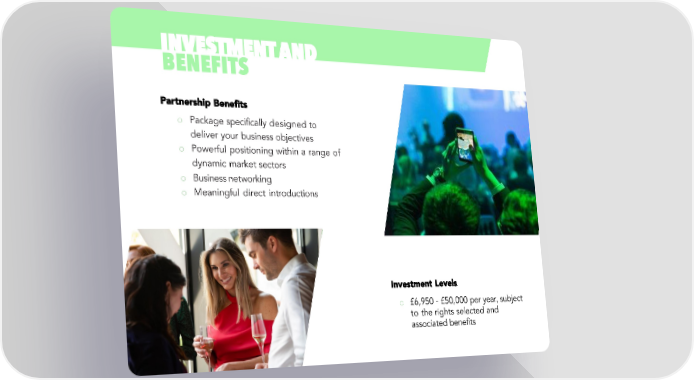 INVESTMENTAND BENEFITS Partnership Benefits o Package specifically designed to deliver your business objectives o Powerful positioning within a range of dynamic market sectors o Businessnetworking o Meaningful direct introductions Investment Levels o £6,950- £50,000 per year, subject to the rights selected and associated benefits